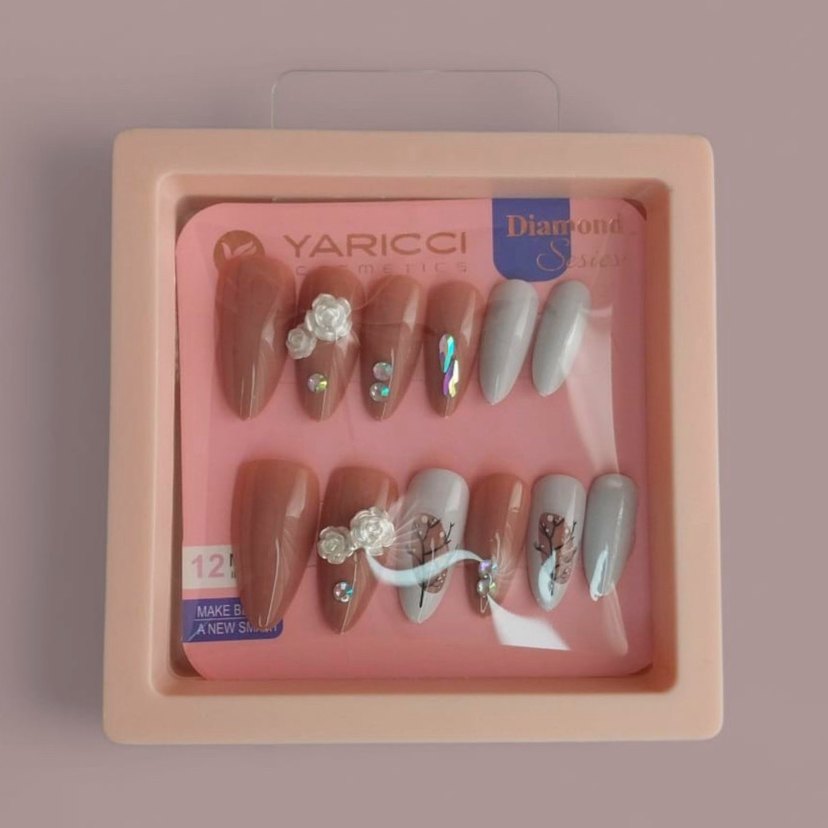 Bej ve gri tonlarında, 3D çiçek detaylı ve küçük taşlı tırnak süslemeleri. Parlak yüzeyli farklı desenlerde tasarımlar içerir.