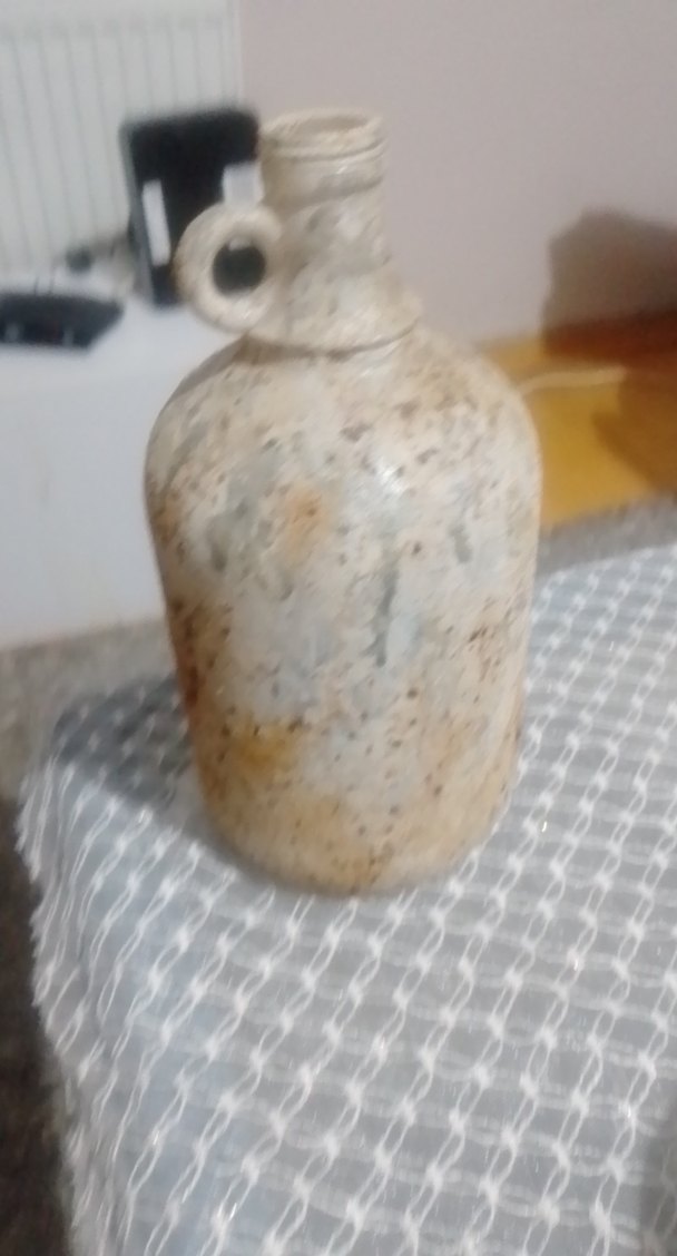 Bej ve gri tonlarında, benekli dokulu seramik vazo. Yuvarlak gövdesi ve boyun kısmında küçük sapı bulunur.