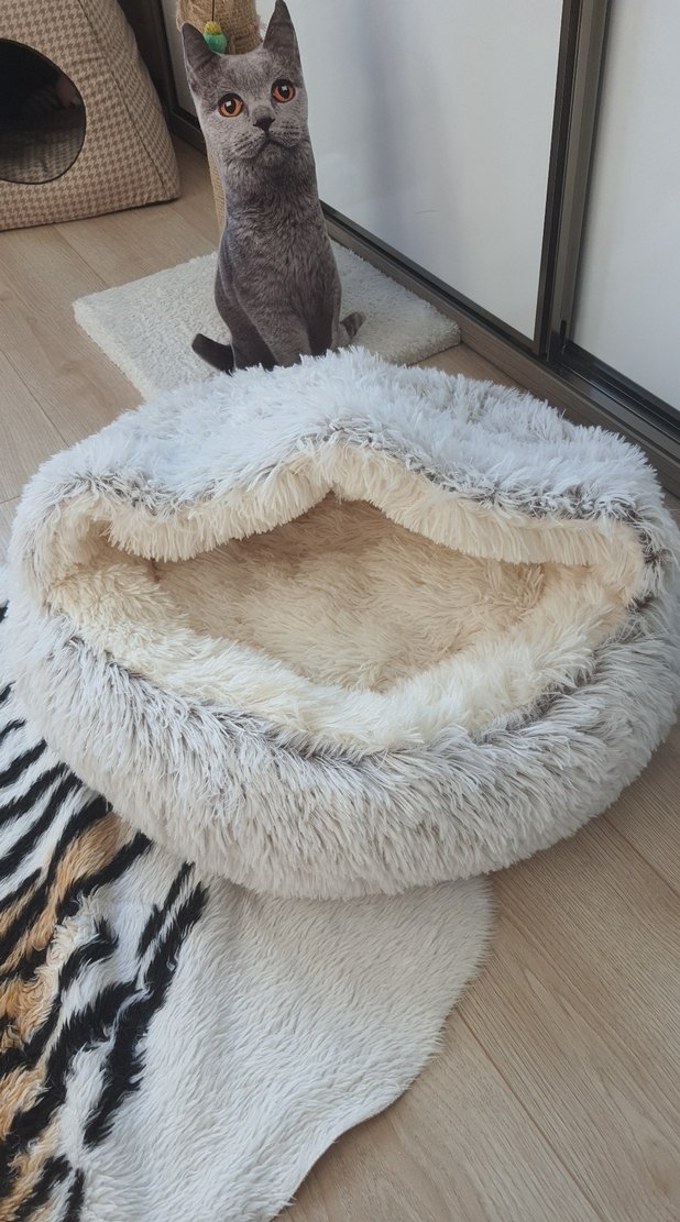 Bej ve gri tüylü, yumuşak iç astarlı kedi yatağı, kediler için sıcak ve rahat bir dinlenme alanı sağlar. Büyük boy 2 kedi girebilir