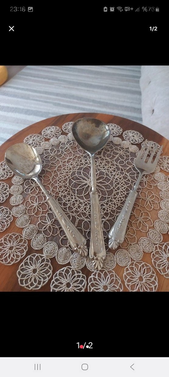 Bej ve gri tonlarda, detaylı saplara sahip vintage kaşık, kepçe ve çatallardan oluşan bir çatal kaşık seti. gümüş kaplama servis setidir.