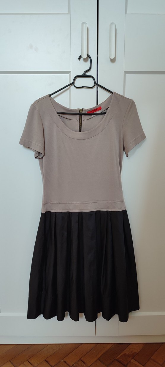 Bej üst kısmı ve kahverengi pileli etek kısmı olan midi elbise, kısa kollu ve salaş kesimdir. Sentetik kumaştan yapılmıştır, günlük kullanıma uygundur. hiç giyilmedi,güle güle giyin inşallah