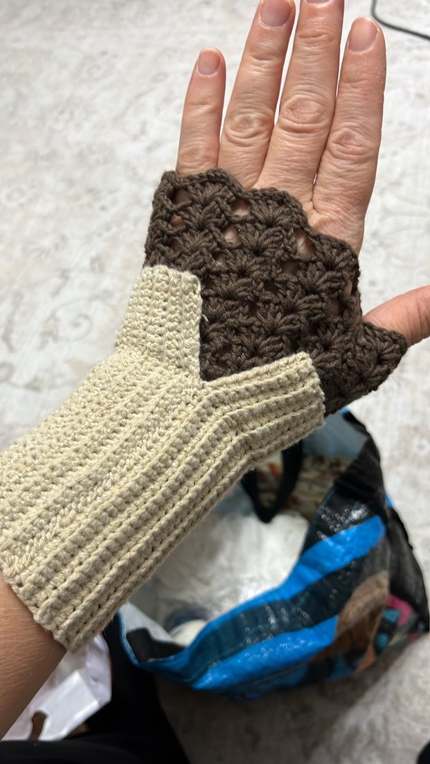 Bej ve kahverengi örgü kadın eldiveni, fitilli ve ince tığ işi desenlerle rahat ve bohem bir tarz sunar.