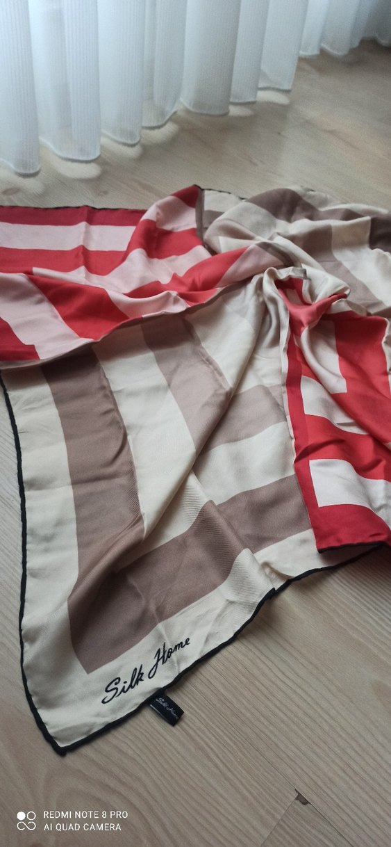 Yumuşak sentetik kumaştan, bej ve kırmızı çizgili, dökümlü kadın fular, çağdaş bohem tarzını yansıtıyor.