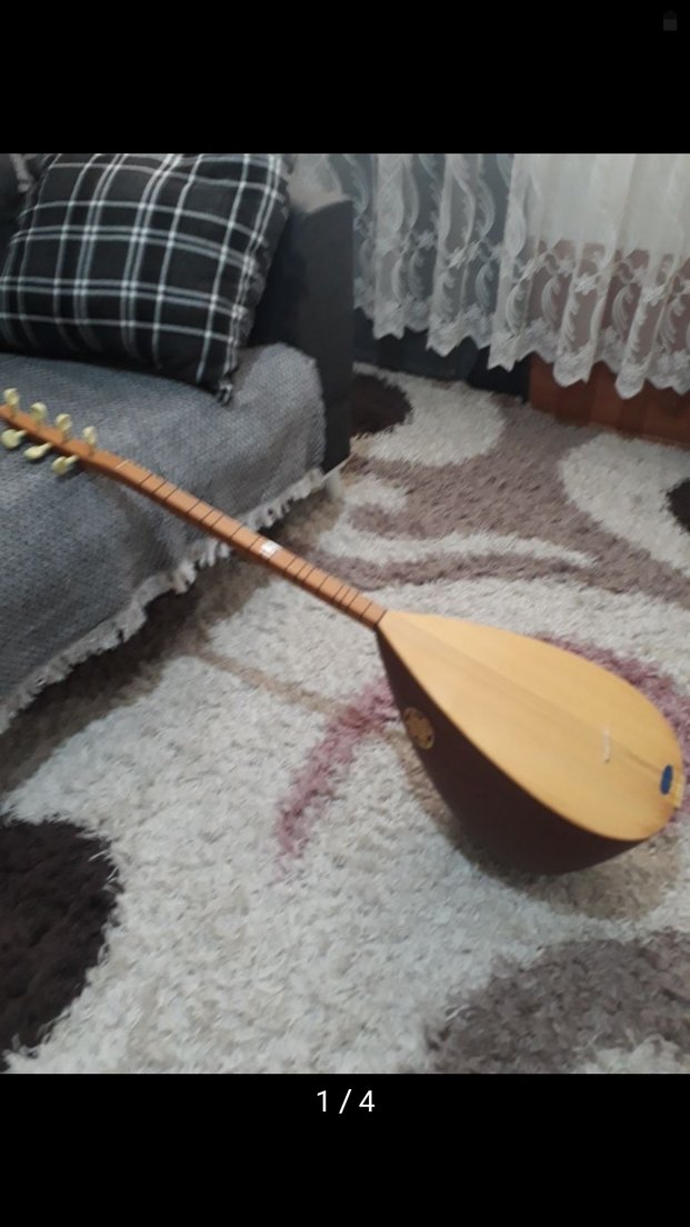 Bej gövde ve koyu renk detaylara sahip geleneksel bağlama, halının üzerinde yer alıyor. Uzun sap ve akort burguları bulunur.