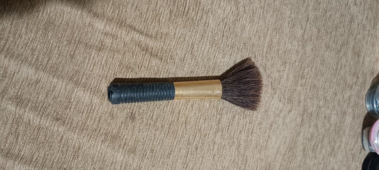 Yumuşak kıllara sahip, koyu renk saplı ve bej metal kısmı olan makyaj fırçası. ️