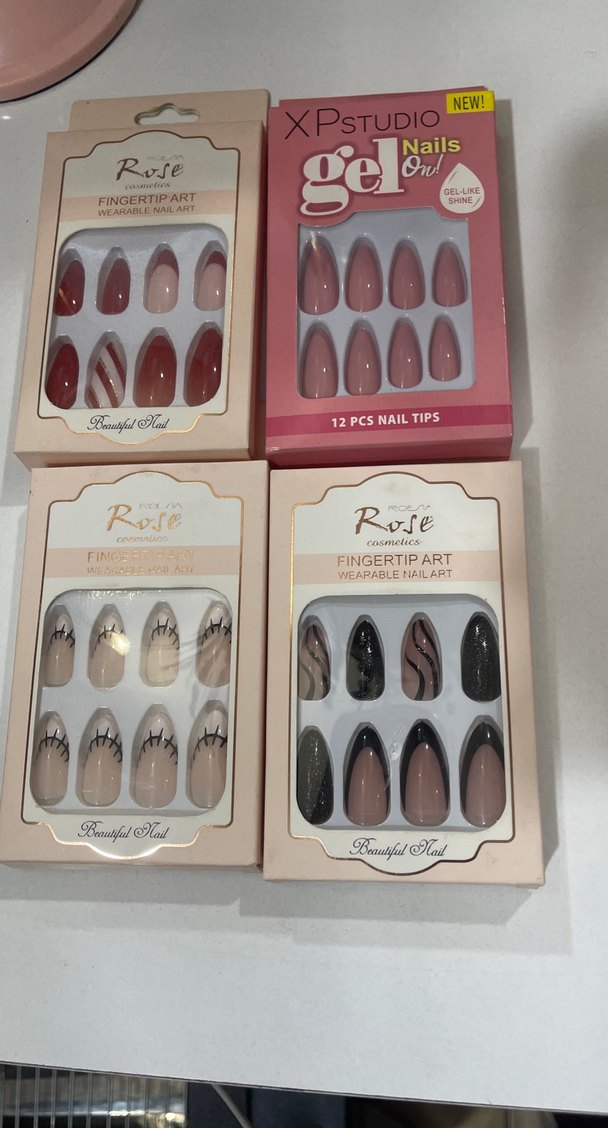 Rose Cosmetics'in 12 parçalık, bej ve koyu renkli çeşitli desenlere sahip tırnak ucu seti.