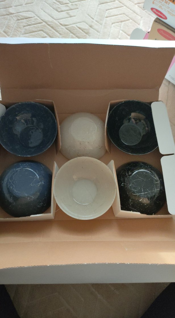 Bej ve koyu renklerde altı adet gıda kabı, her biri kutuda ayrı bölmede yer alıyor.