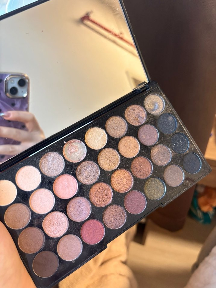 Bej ve koyu tonlarda, mat ve ışıltılı dokuda çeşitli göz farları içeren palet.