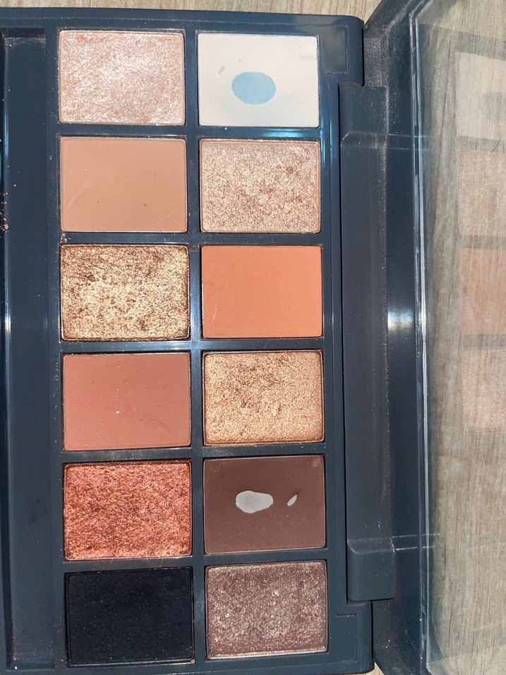 Mat ve ışıltılı bitişli bej ve koyu tonlarda göz farı paleti, çeşitli makyaj stilleri için uygundur.