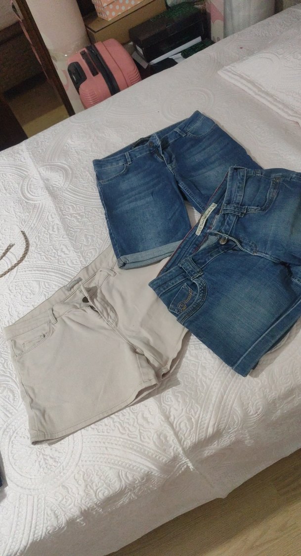 Bej ve mavi renklerde, rahat kesim ve mini uzunlukta kadın kot şortlar. Günlük kullanım için uygun, salaş ve şık bir tarz sunar. Üçü birlikte