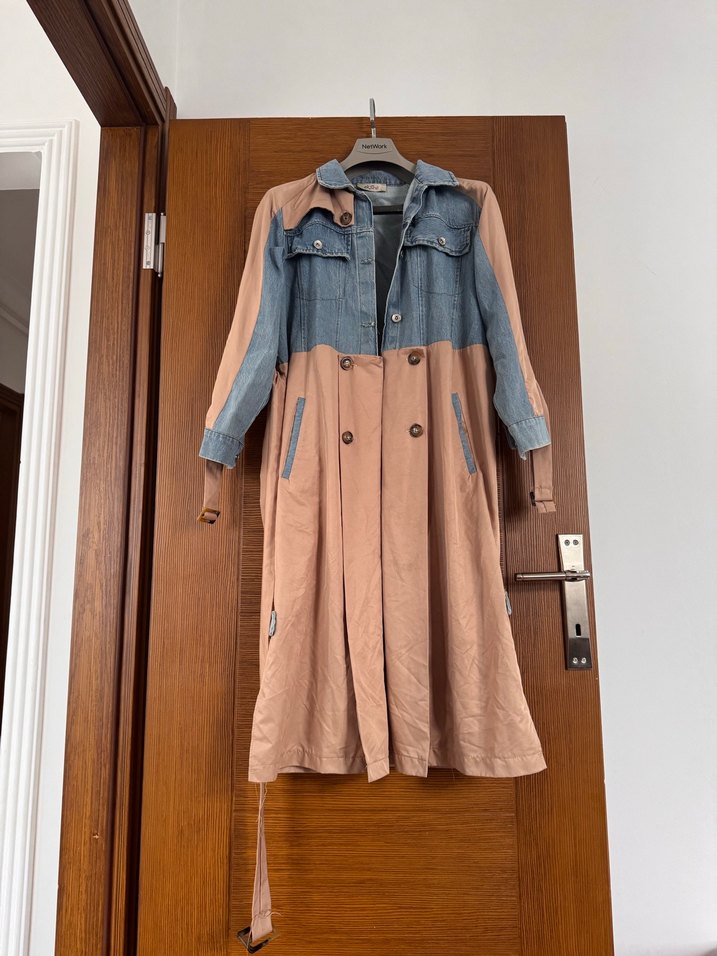 Bej ve mavi denim kumaşın birleşimi olan bu uzun trençkot, düğmeli ön kısmı, geniş kesimi, yakası ve uzun kollarıyla rahat bir tarz sunar.
