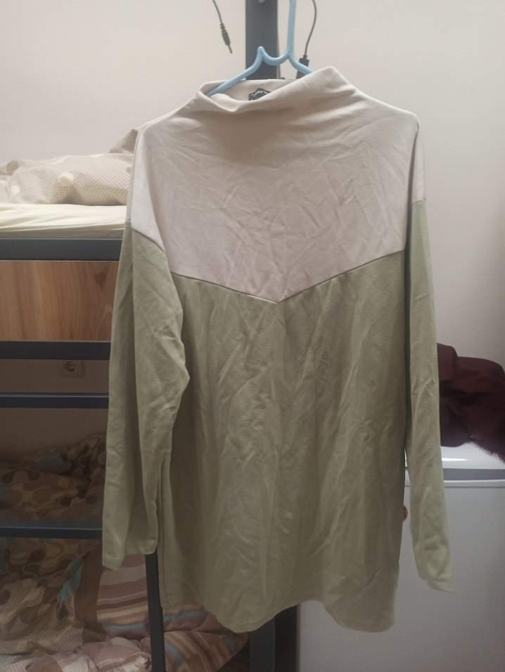 Uzun kollu, boğazlı ve drapeli tasarıma sahip, gevşek kesim hamile bluzu. Midi boyda, pastel bej renkte, yumuşak sentetik kumaştan, günlük sokak stili için uygun.