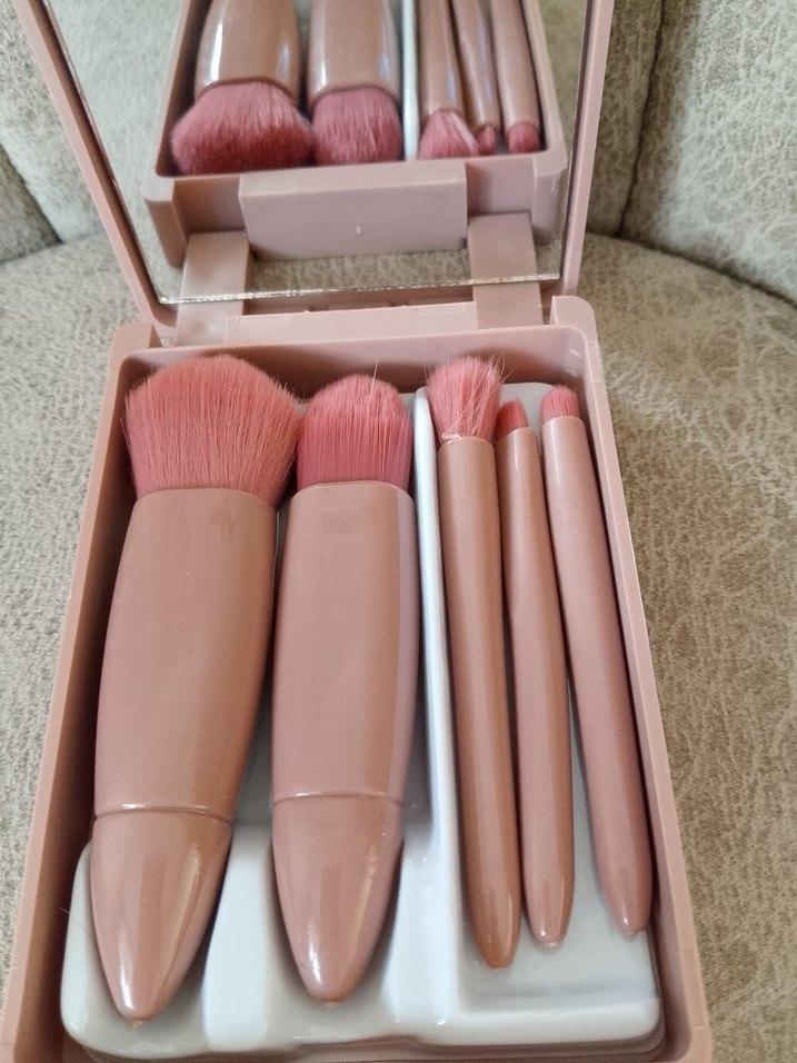 Yumuşak pembe kıllara ve bej saplara sahip altı makyaj fırçası, ayna içeren kompakt bir kutuda.