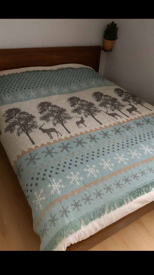 Bej ve pastel tonlarda baskılı, ağaç ve geyik desenleri ile süslenmiş yatak örtüsü. Yumuşak dokulu ve püsküllü kenarlara sahiptir. ❄️ceyizim icin almıştım kullanmadım
