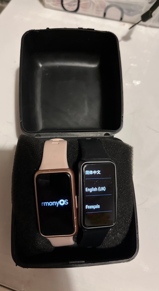 Bej ve siyah renklerde, HarmonyOS işletim sistemine sahip, Fransızca ve İngilizce dil seçenekli iki akıllı saat seti. ⌚