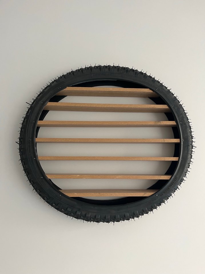 Bej renkli ahşap çıtalara ve siyah lastik çerçeveye sahip yuvarlak çocuk rafı, eğlenceli ve kullanışlı tasarım sunar.