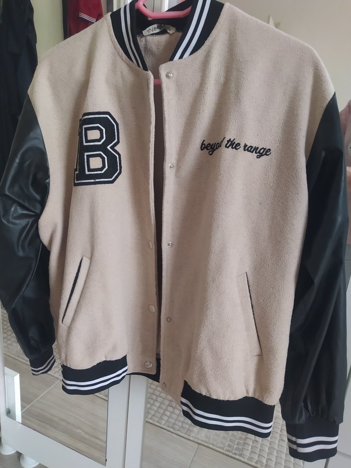 Bej ve siyah renklerde, düğmeli, uzun kollu, bol kesim kadın ceket. Bisiklet yaka ve baskılı detaylara sahip, günlük kullanıma uygun.