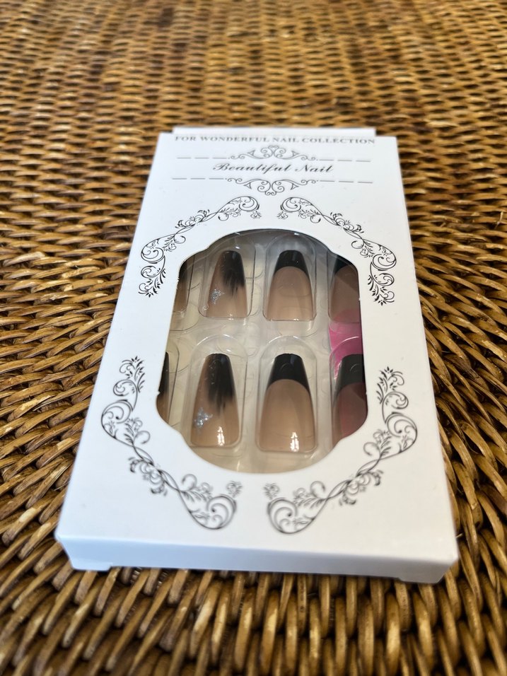 Bej renkte, siyah Fransız ucu detaylı takma tırnak seti, şık ve klasik bir görünüm sunar. 24 adet tırnak 24 adet yapıştırıcı bir adet törpü