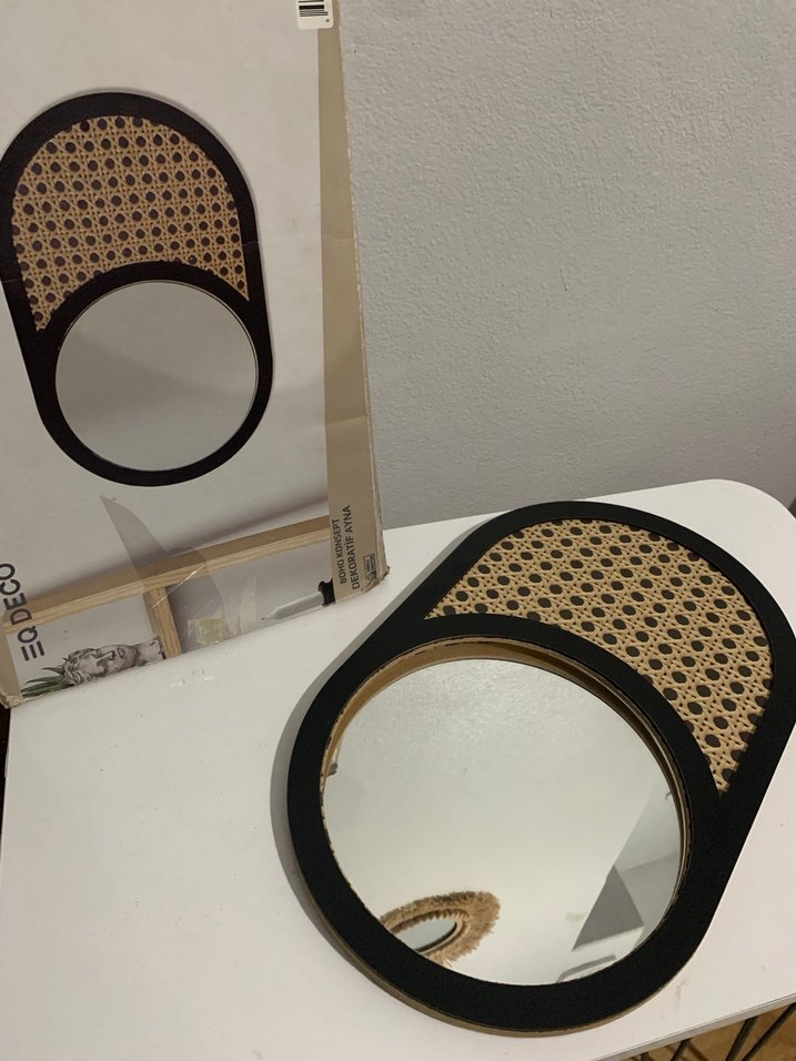 Bej ve siyah çerçeveli, dokuma desenli kedi aksesuarı aynası. Evcil alanınıza şıklık ve işlevsellik katıyor.