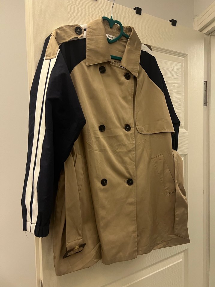 Düğmeli, yakalı ve uzun kollu midi trençkot. Siyah ve gri spor detaylarla rahat kesim, sentetik kumaştan üretilmiştir.