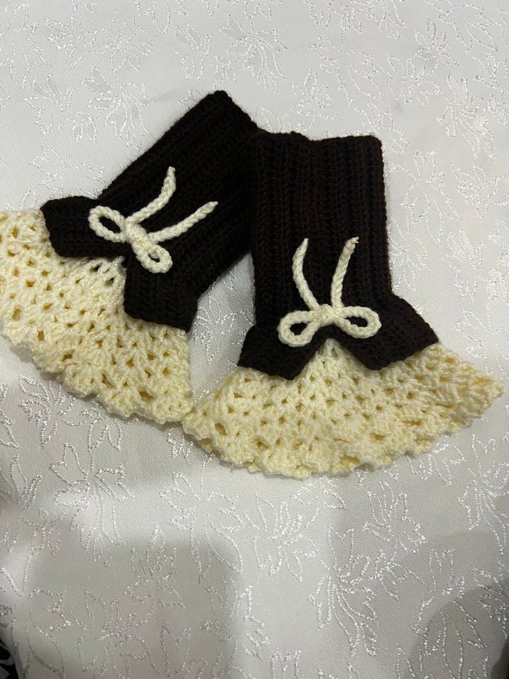 El emeği Bu kadın eldivenleri koyu kahve ve bej tonlarında örgü tasarıma sahiptir, rahat örgü kumaş ve gotik stili bir araya getirir. Fırfırlı uç ve dekoratif fiyonk bulunur. Alize ipliklerle örüldü