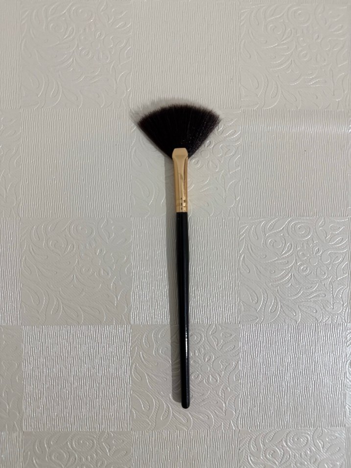 Koyu renk sap ve bej yelpaze şeklinde kıllara sahip makyaj fırçası, hassas uygulama için uygundur. ️