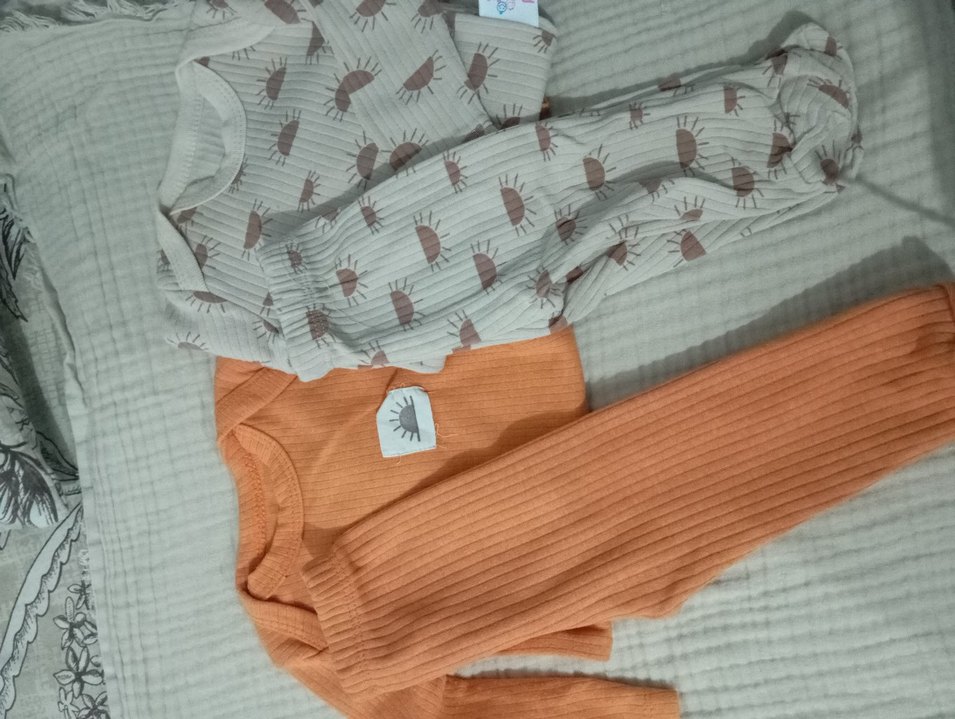 Bej ve turuncu renklerde, yumuşak ve ribanalı kumaştan yapılmış çocuk atlet takımı. Bej parça güneş desenli, turuncu parça küçük göz patch'lı.