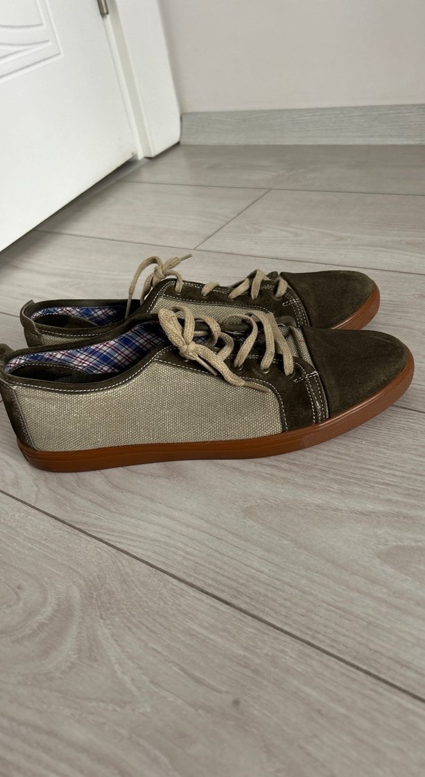 Bej ve yeşil renklerde, bağcıklı ve kahverengi kauçuk tabanlı erkek günlük ayakkabısı, sokak stili için uygun. Ürün çok az kullanıldı. Hiç bir kusuru yoktur. Yeşil renkteki yerler süettir.43 numaradır.