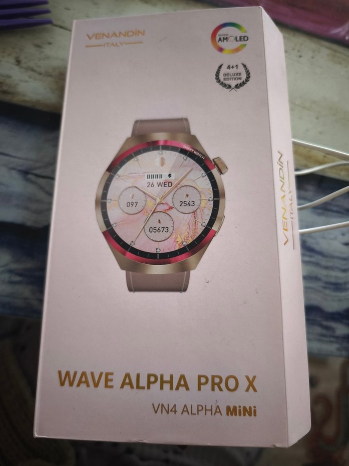 Bej renkli Venandin Wave Alpha Pro X akıllı saat, hafif renkli kayış ve AMOLED ekran sunar. VN4 Alpha Mini teknolojisi ve tarih ile sağlık bilgilerini gösterir.⌚