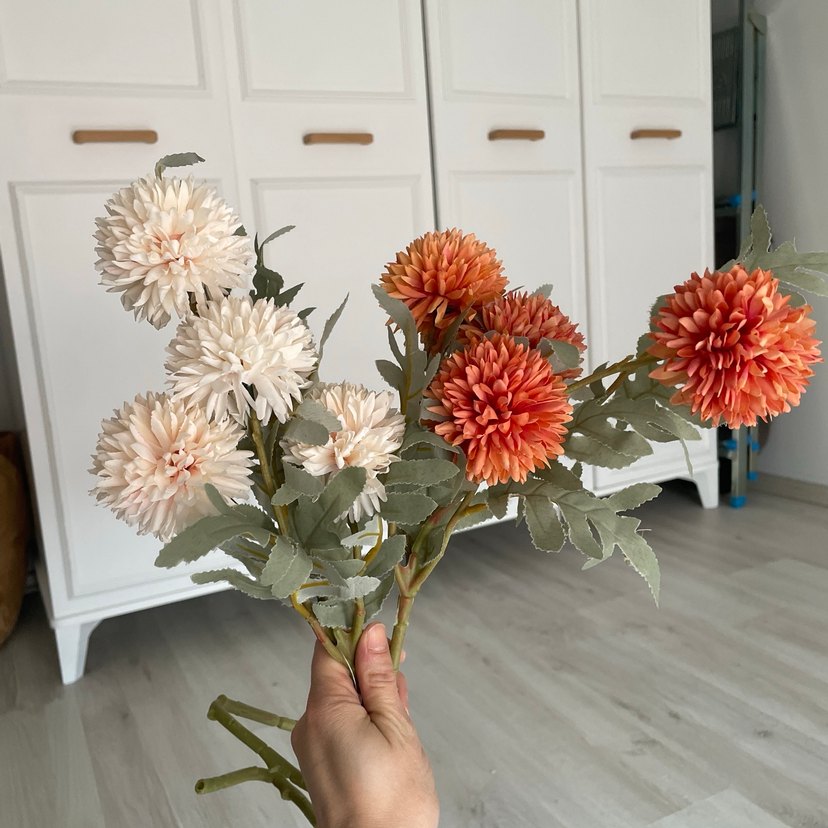 Tek demet fiyatıdır. Orjinal fiyatını en sona ekledim. Bej ve turuncu renklerde yapay çiçeklerden oluşan dekoratif bir demet, ev dekorasyonunu canlandırmak için ideal.