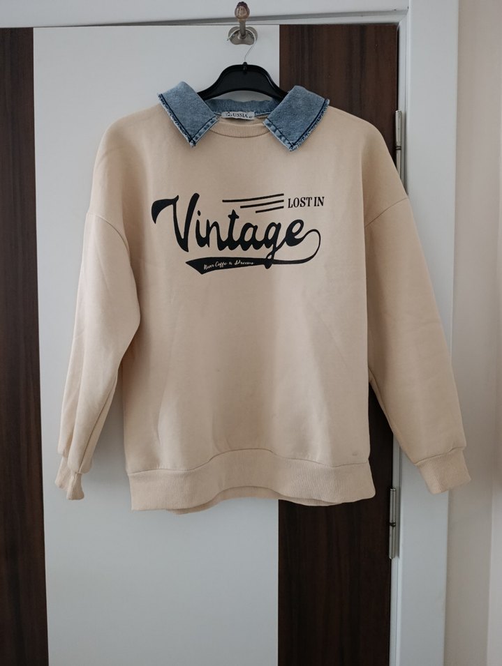 Uzun kollu, bisiklet yaka, bol kesim bej sweatshirt. Vintage baskılı, düğmeli denim yakalı, günlük rahat şıklık sunar.