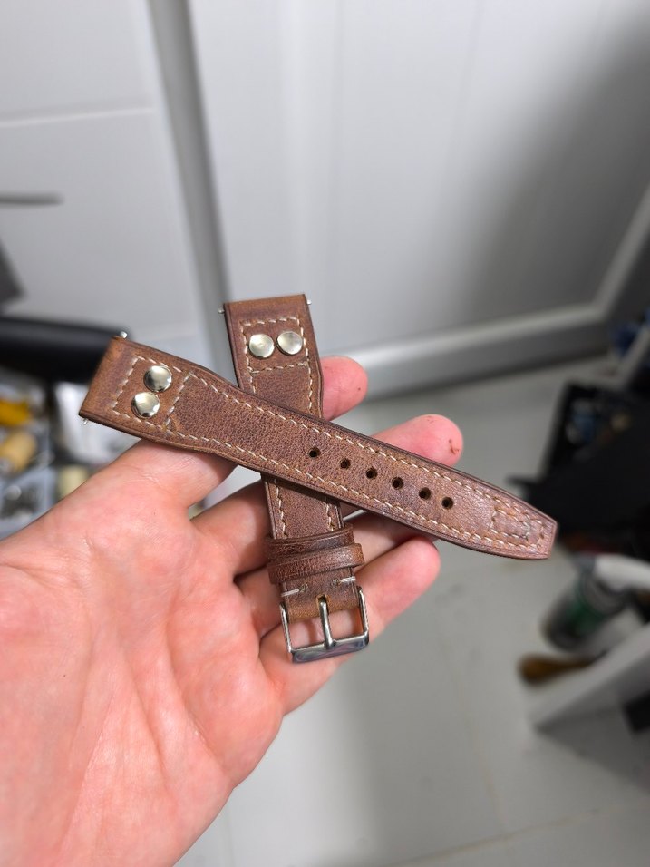 Koyu bej renkli, metal perçinli ve sağlam dikişli vintage biker tarzı erkek saat kayışı. Klasik ve kullanılmış görünüm sunar. ⌚