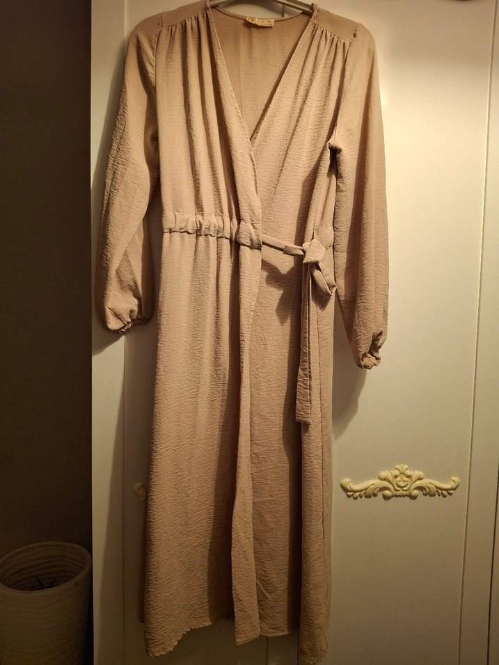 Açık bej renkte, bol kesim uzun kadın elbisesi. Sarma tarzı, ince askılı ve bağcıklı bel detayıyla vintage bohem tarzı sunar.