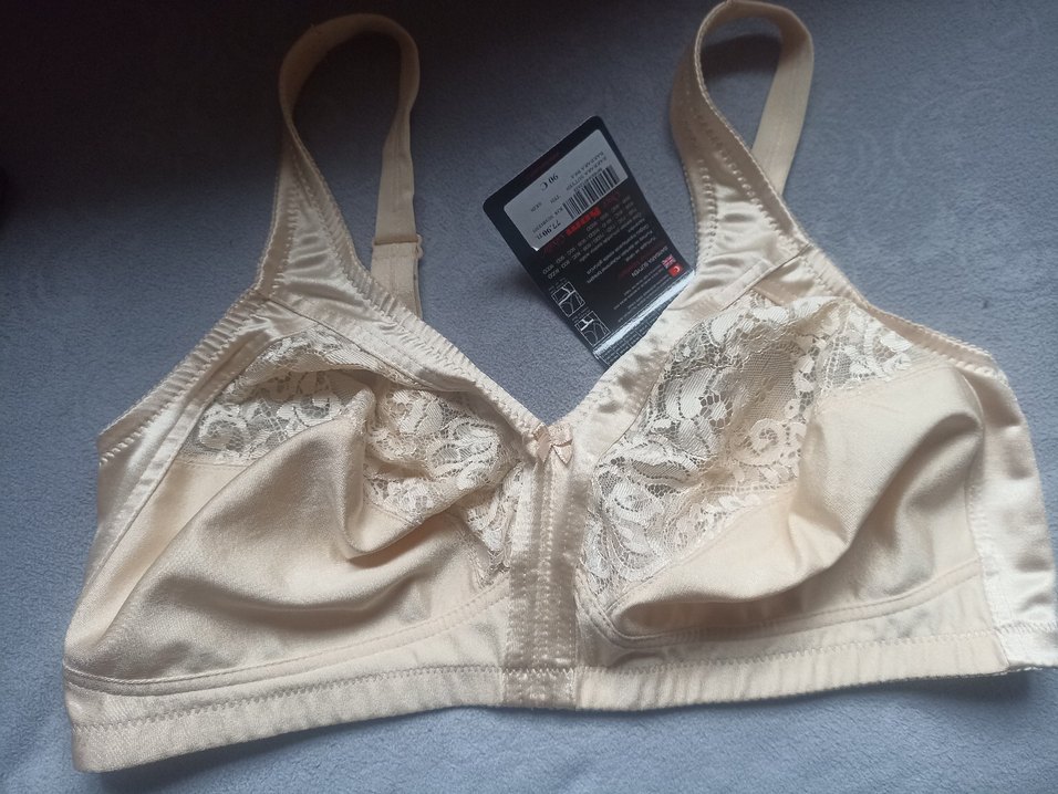 Bej renkte, dantelli detaylara sahip vintage tarz sütyen. Ayarlanabilir askıları ve konforlu destek sunan yumuşak kumaşı vardır.