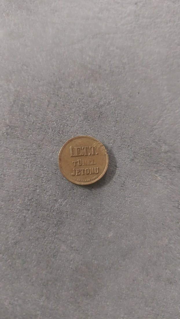 Parlak bej renkte, 'JETONU' yazılı vintage erkek rozeti, karşı kültür tarzında ve eski moda bir görünüme sahip. ️