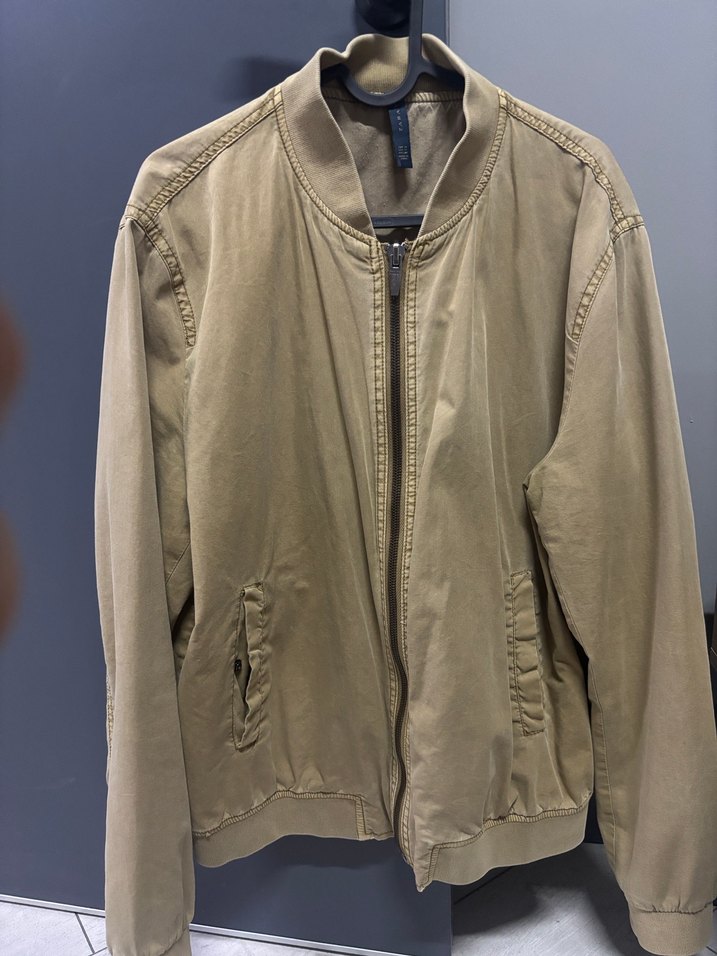 bej erkek ceket, fermuarlı ön ve uzun kollu, rahat kesimli.