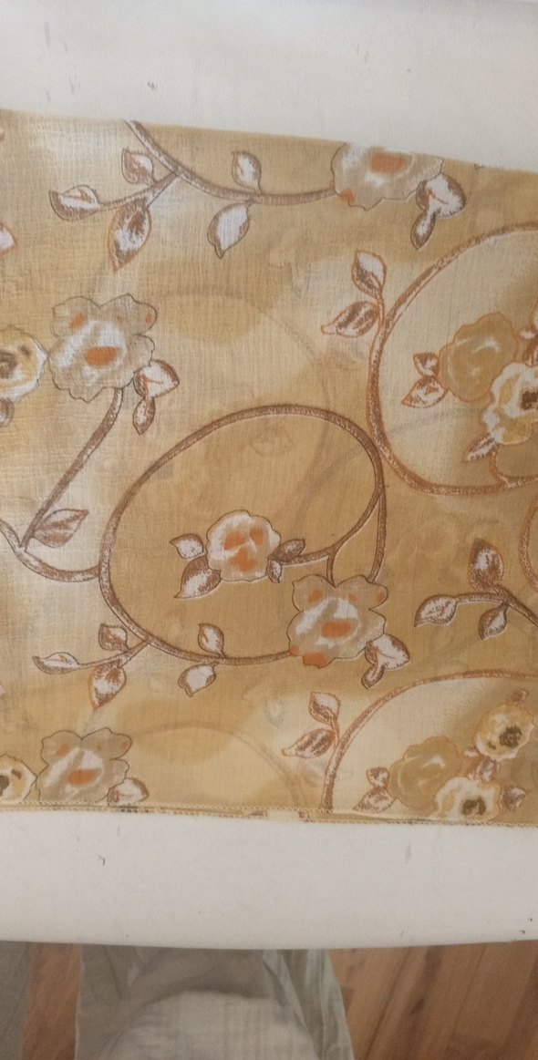 Yumuşak sentetik kumaştan, parlak bej vintage kadın yazma Çiçek desenli ve bohem, retro tarzlara uygun drapeli model.