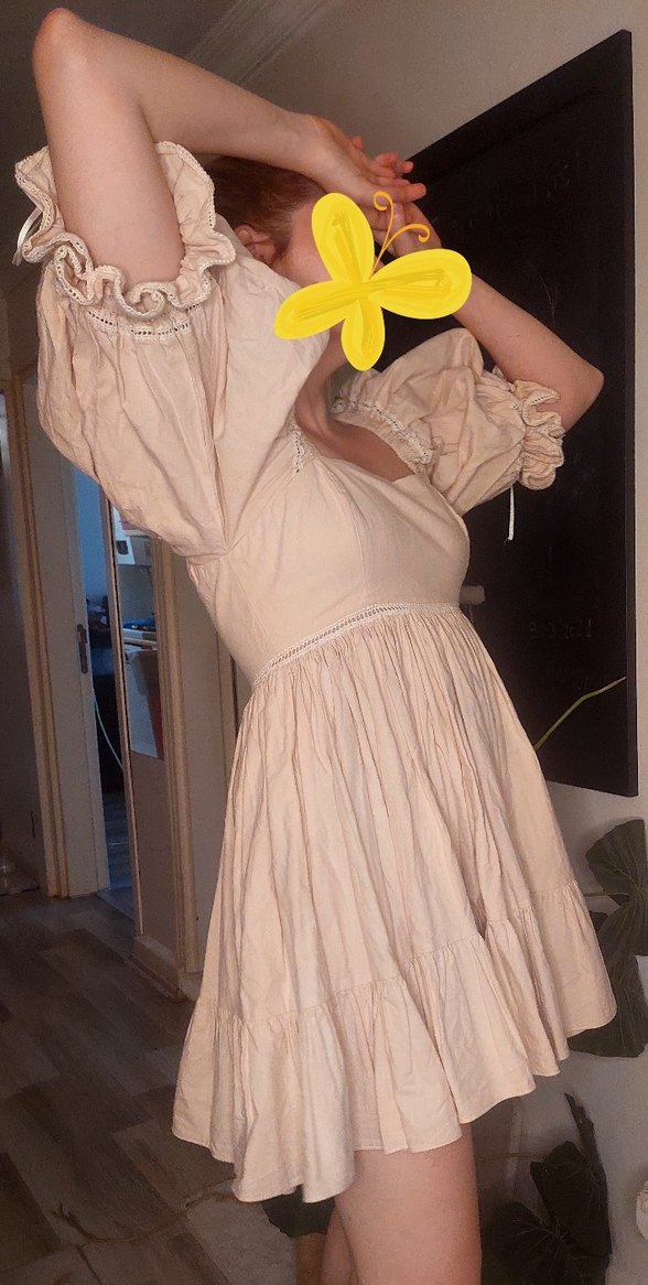 %100 pamuk kumaştan, el yapımı, Selkie tarzı puff kollu bej mini elbise. Dantel detayları vintage tarzda parti için uygun.