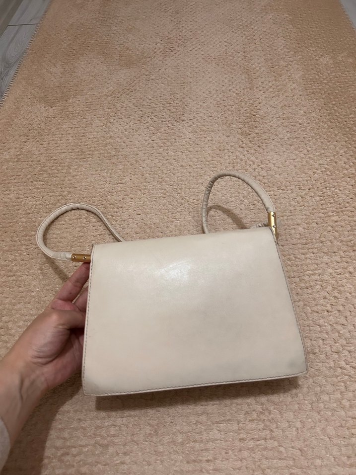 Krem çanta. Normalde hiçbir lekesi yoktu. Uzun süredir dolapta yanında siyah bir çantayla duruyordu. Sanırım ondan geçti rengi, çıkar mı bilmiyorum, o yüzden fiyata yansıttım bunu. Ters kullanılabilir, kullanıma engel değil Bej renkte, minimalist ve vintage tarzda kadın çantası. Tokalı askısı ve desensiz düz yüzeyi ile klasik şıklık sunar, günlük kullanıma uygundur.