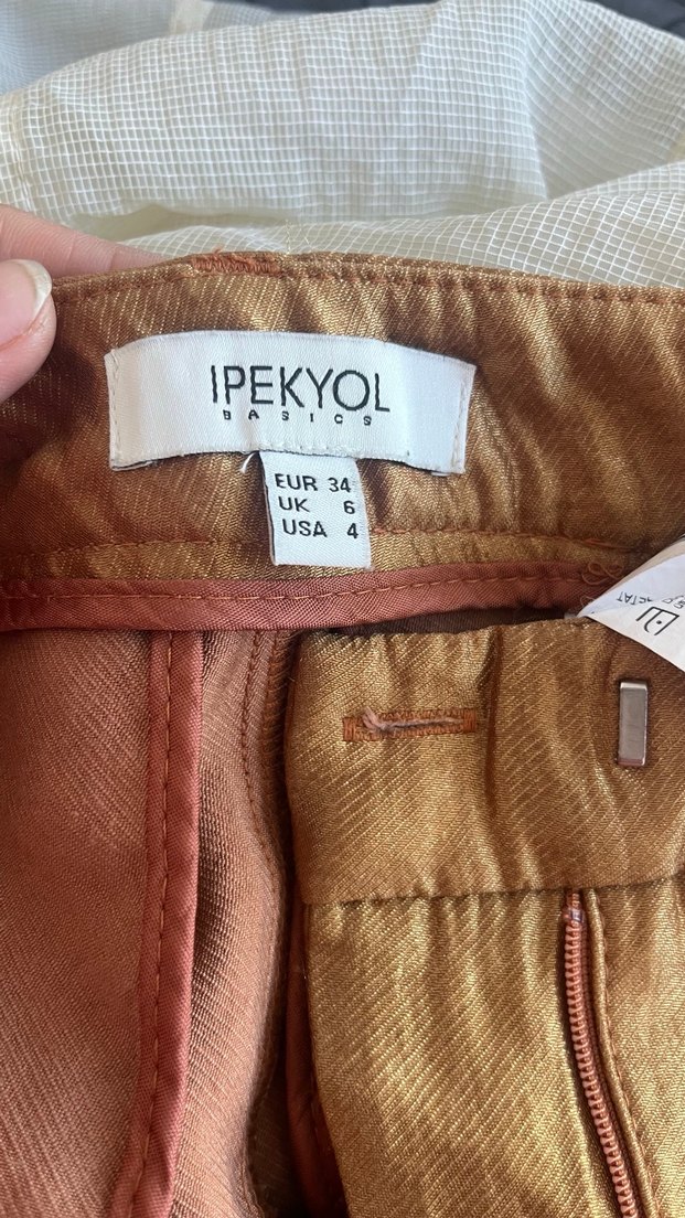 İpekyol Basics markasına ait bej vintage tarzda, yumuşak dokulu pantolon. Bohem ve retro tarzlarla uyumlu, sokak modası için uygun. Bedenler: EUR 34, UK 6, USA 4.