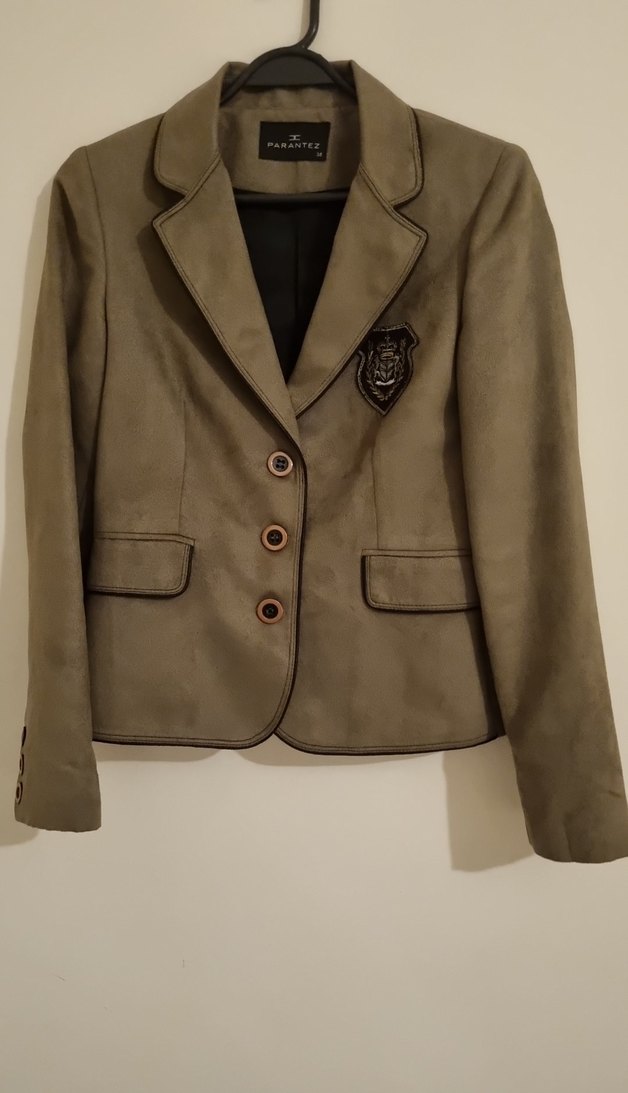 Bej / vizon süet kumaştan yapılmış, düğmeli, uzun kollu ve normal boyda kadın blazer ceket. İş ortamı ve günlük kullanıma uygun klasik ve şık tasarım.