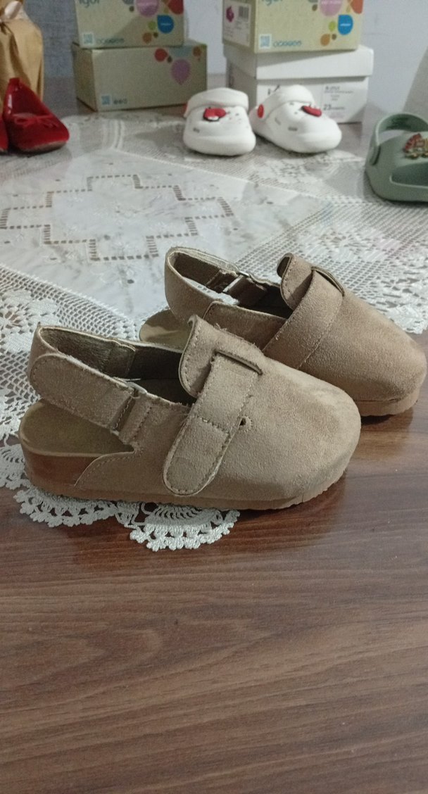 Bej süet malzemeden yapılmış, tokalı ve desen içermeyen kız çocuk terlik. bir defa kullanıldı sıfır durumda leke ve çizik bile yok. tam kalıp