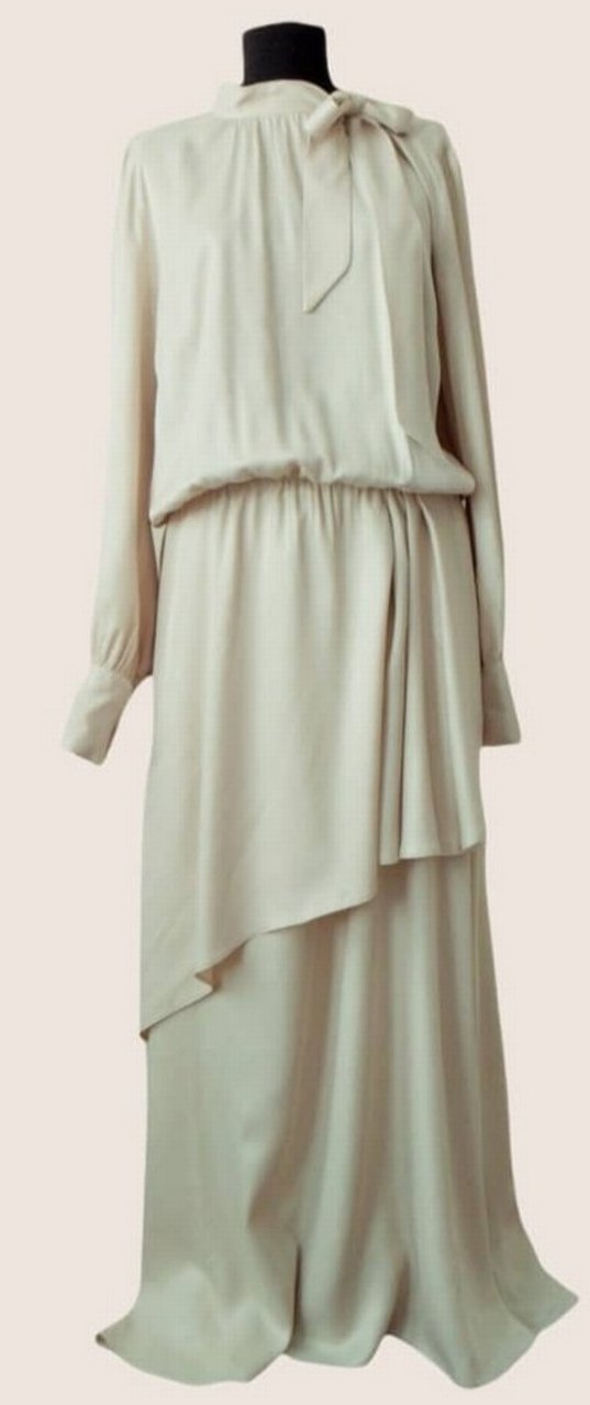 Bej renkte, uzun kollu ve salaş kesim kadın elbisesi. Sırttan bele kadar fermuarlı Dökümlü Kumaş