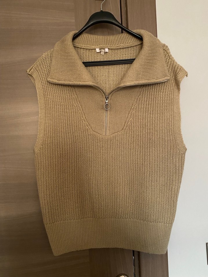 Bej renk, fermuarlı yüksek yakalı, örme triko süveter. Kolsuz ve vücuda oturan kesimiyle günlük sokak stiline uygun rahat bir parça.