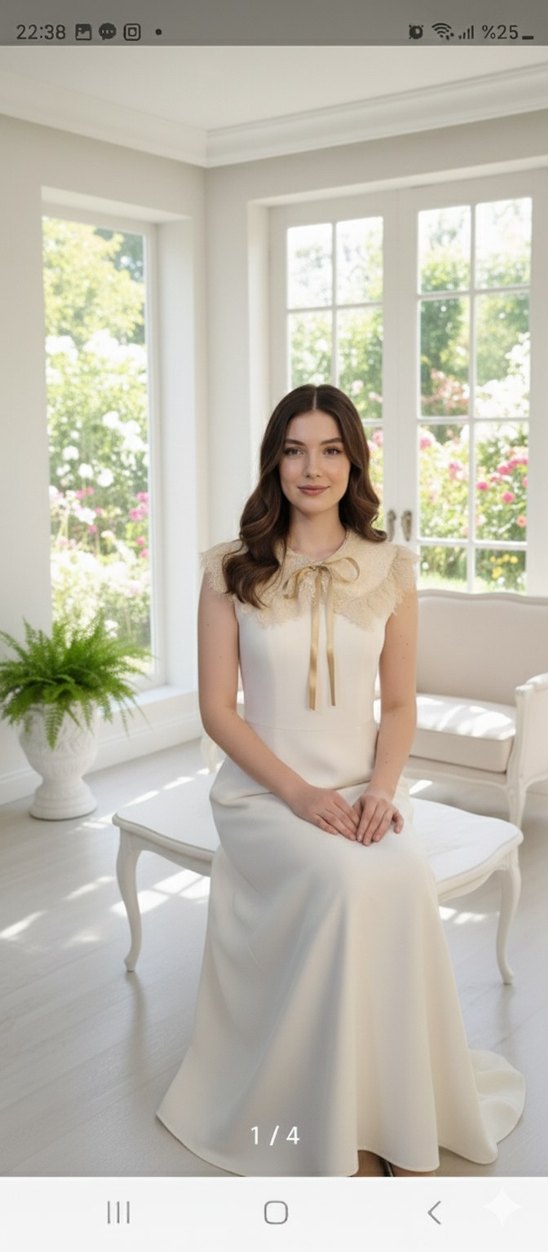 Bej midi uzunluğunda, straplez yakalı, dantel yakalı ve fiyonk detaylı klasik düğün elbisesi. Kolsuz ve regular fit kesimiyle modern klasik tarzı yansıtıyor.
