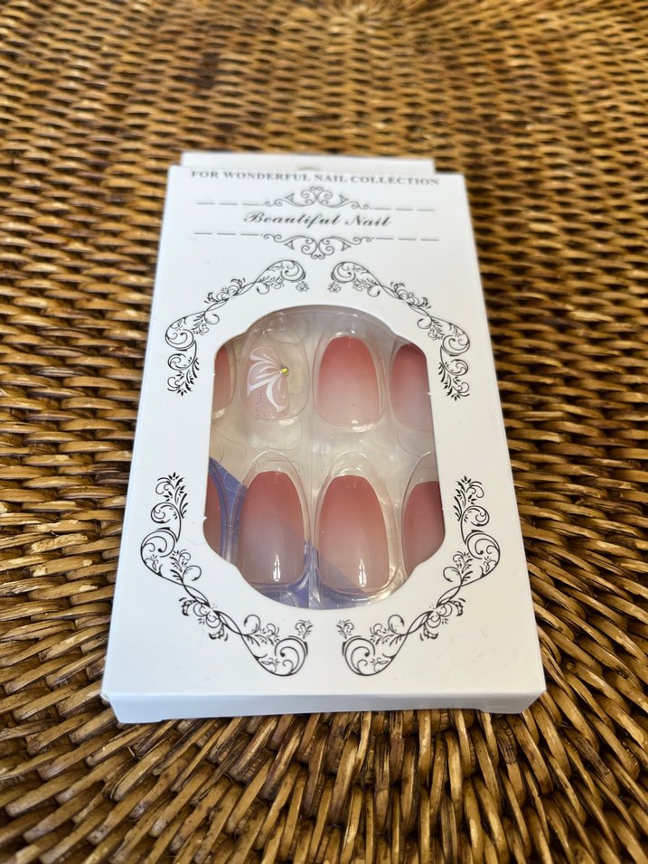 Bej renkte, çiçek desenli yapay tırnak seti, doğal ve şık bir görünüm sağlar. 24 adet tırnak 24 adet yapıştırıcı bir adet törpü