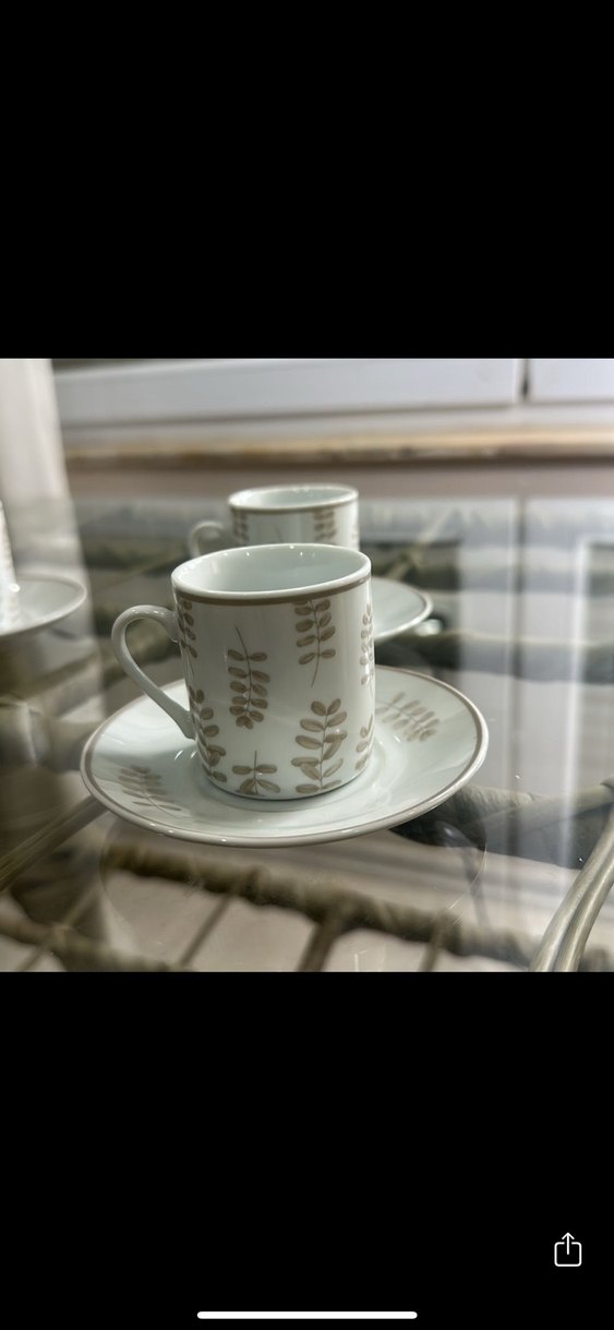 Bej renkte, gri yaprak desenli fincan ve tabağı, sıcak içecekler için uygundur. Lc homedır