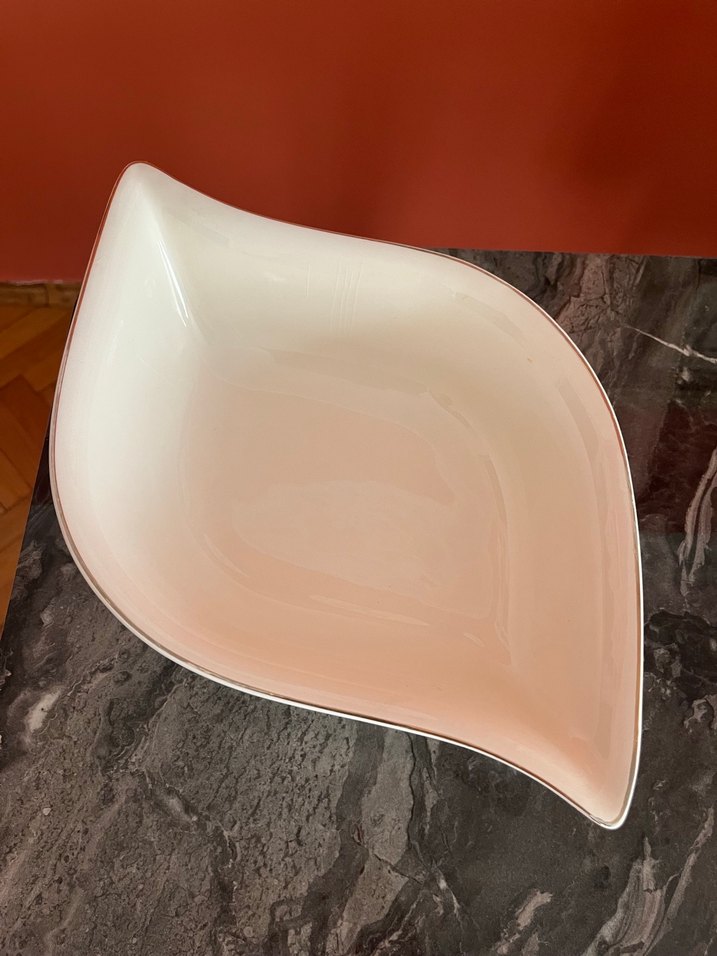 Bej renkli yaprak şeklinde servis kasesi, atıştırmalık veya salata sunumu için uygun. Hafif ve şık tasarım. ️Yüzeyinde hafif çatlaklar mevcuttur.