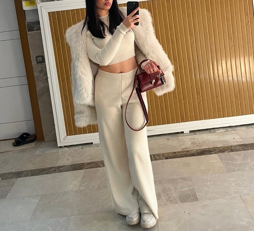 Bej Yarım Balıkçı Örgü Crop Kazak Pantolon Triko Takım