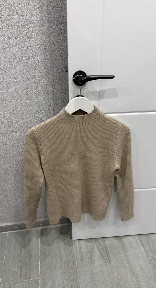 Bej renkli, yüksek yaka ve uzun kollu örme triko kazak, vücuda oturan ve normal boyda, rahat günlük kullanım için uygundur.